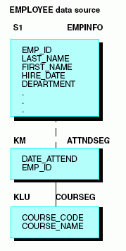 In your EMPLOYEE data source application, you may need the security information stored in the SECSEG segment and the job skill information stored in the SKILLSEG segment. After you have created a join, you can access any or all of the other segments in the cross-referenced data source using the SEGTYPE value KL for a one-to-many relationship (as seen from the host data source), and KLU for a one-to-one relationship (as seen from the host data source). KL and KLU are used to access descendant segments in a cross-referenced data source for both static (KM) and dynamic (DKM) joins.