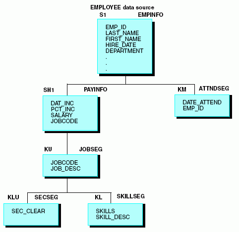 FILENAME = EMPLOYEE, SUFFIX = FOC, $ SEGNAME = EMPINFO, SEGTYPE = S1, $ FIELDNAME = EMP_ID, ALIAS = EID, FORMAT = A9, $ . . . SEGNAME = PAYINFO, SEGTYPE = SH1, PARENT = EMPINFO, $ FIELDNAME = JOBCODE, ALIAS = JBC, FORMAT = A3, $ . . . SEGNAME = JOBSEG, SEGTYPE = KU, PARENT = PAYINFO, CRFILE = JOBFILE, CRKEY = JOBCODE, $ SEGNAME = SECSEG, SEGTYPE = KLU,PARENT = JOBSEG, CRFILE = JOBFILE, $ SEGNAME = SKILLSEG, SEGTYPE = KL, PARENT = JOBSEG, CRFILE = JOBFILE, $ SEGNAME = ATTNDSEG, SEGTYPE = KM, PARENT = EMPINFO, CRFILE = EDUCFILE, CRKEY = EMP_ID, $ SEGNAME = COURSEG, SEGTYPE = KLU,PARENT = ATTNDSEG, CRFILE = EDUCFILE, $