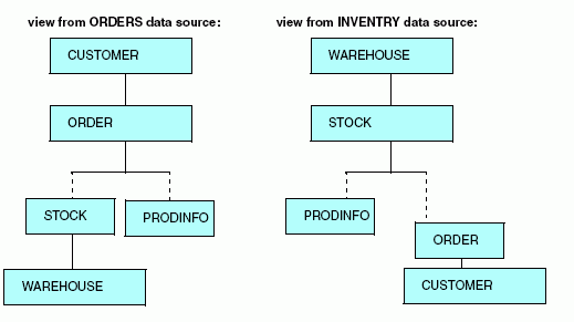 In addition, there is a one-to-many join from the STOCK segment in the INVENTRY data source to the ORDER segment in the ORDERS data source, and a reciprocal one-to-many join from the ORDER segment in the ORDERS data source to the STOCK segment in the INVENTRY data source.
