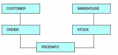 The CUSTOMER and ORDER segments are in the ORDERS data source, the WAREHOUSE and STOCK segments are in the INVENTRY data source, and the PRODINFO segment is stored in the PRODUCTS data source. Both the INVENTRY and ORDERS data sources have one-to-one joins to the PRODUCTS data source. In the INVENTRY data source, STOCK is the host segment. In the ORDERS data source, ORDER is the host segment.